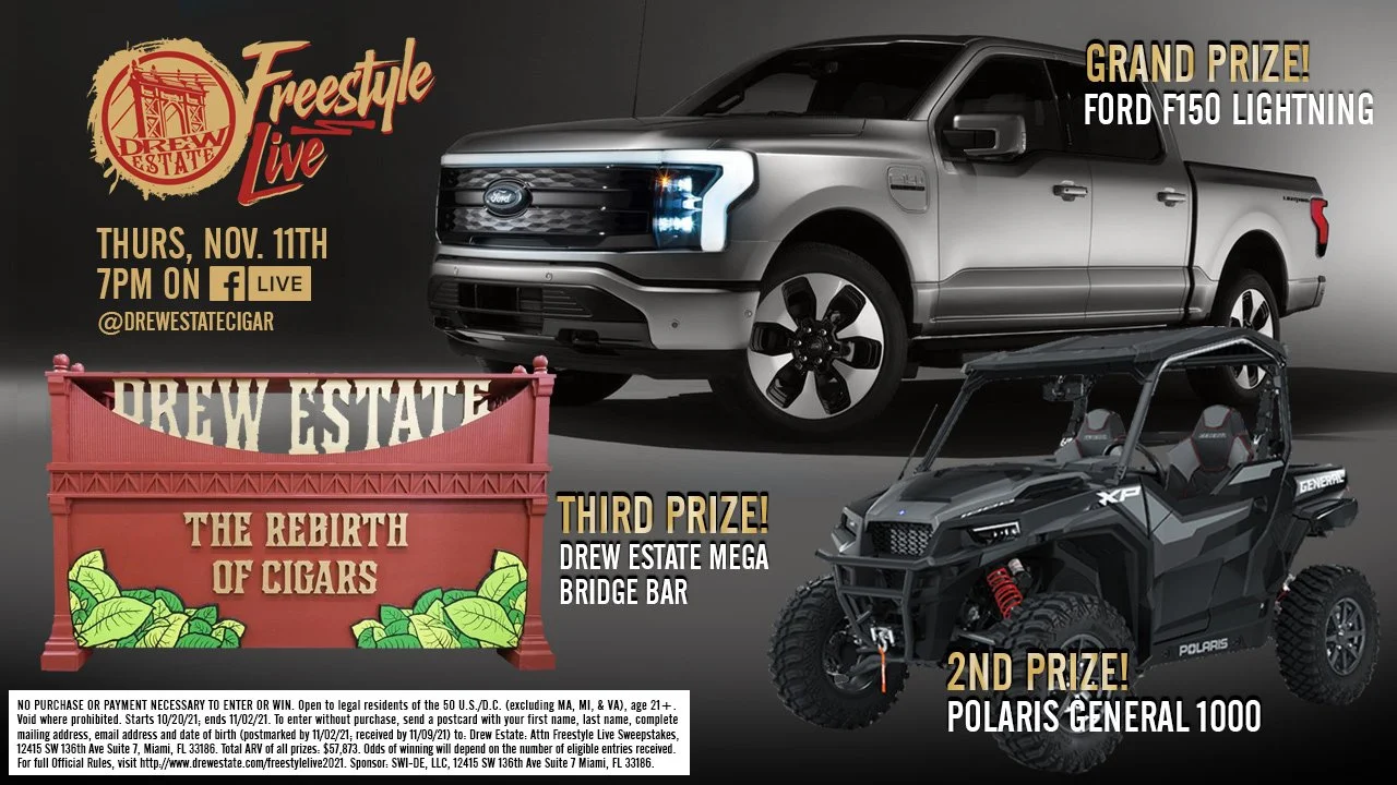 Your exclusive pack will include all the swag you see here along with your lanyard and badge to access the Thursday, November 11th at 7 PM virtual event broadcast. Register your badge to be eligible for prizes -- PLUS attendees of the LIVE event can comment to be eligible for additional prizes — check out the Drew Estate Freestyle 2021 page for all the winning details!